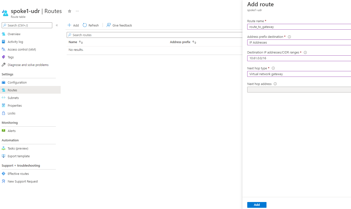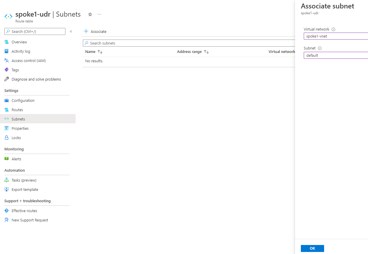 spoke1-udr, spoke2-udr을 각각 만들어 줍니다