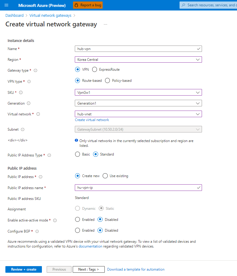(게이트웨이 서브넷 이름은 무조건 'GatewaySubnet'이어야 함)