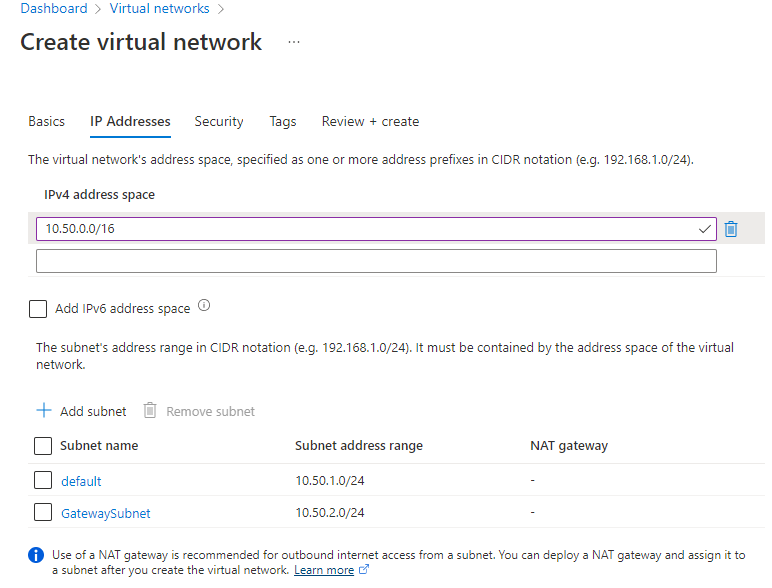 hub-vnet : 10.50.0.0/16, default 10.50.1.0/24, GatewaySubnet 10.50.2.0/24