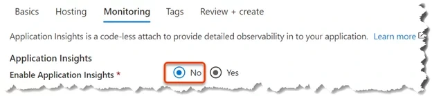 Application Insights is a code-less attach to provide detailed observability into your application.Don’t enable Application Insights as its not really required for this scenario.