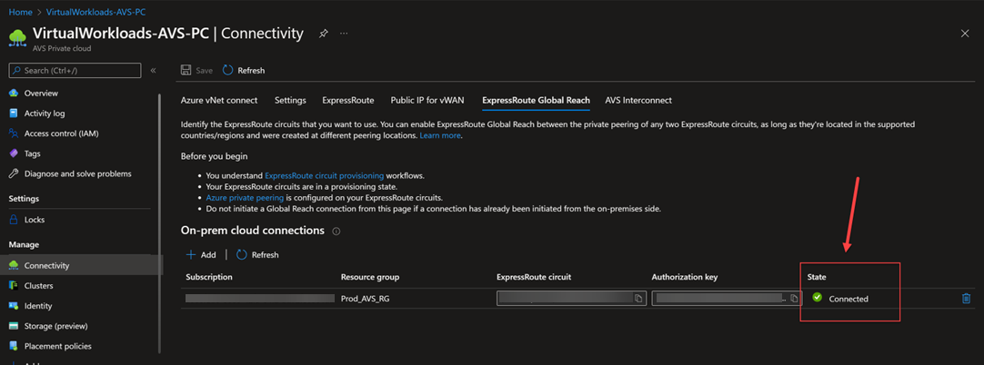 - 이제 상태가 "연결됨"으로 표시됩니다. AVS 프라이빗 클라우드와 온프레미스 환경이 이제 연결되었을 것입니다.