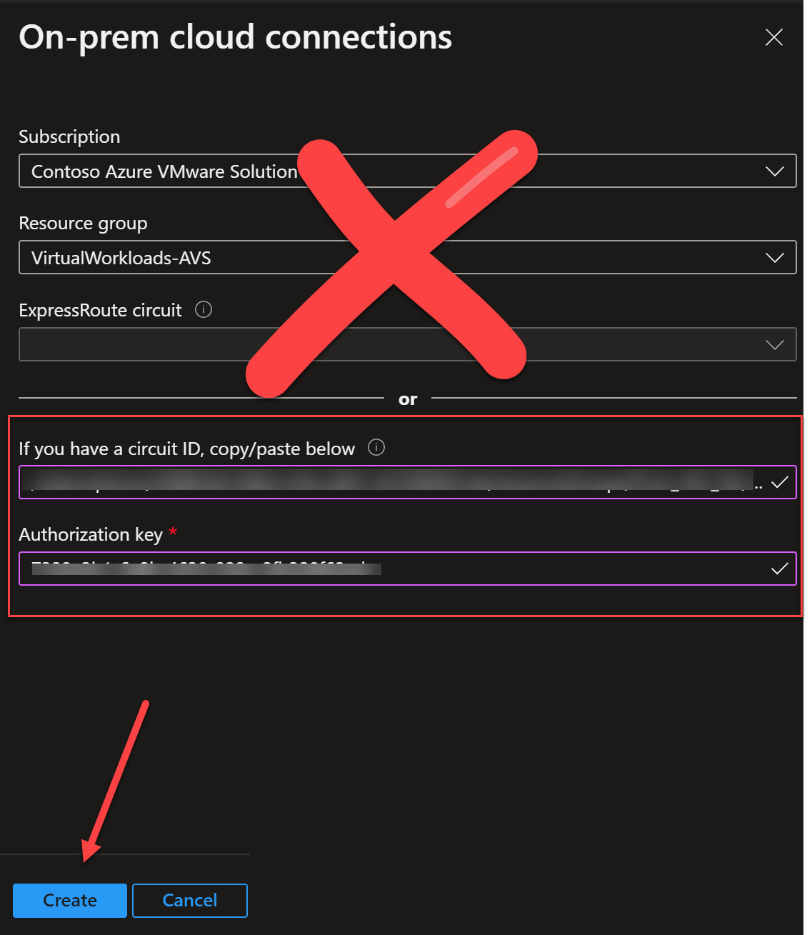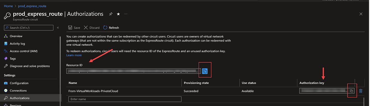 여기서는 온프레미스 ExpressRoute에서 권한 부여 키가 생성되며, 이 키는 AVS 포털에서 ExpressRoute Global Reach 회로에 연결하는 데 사용됩니다.