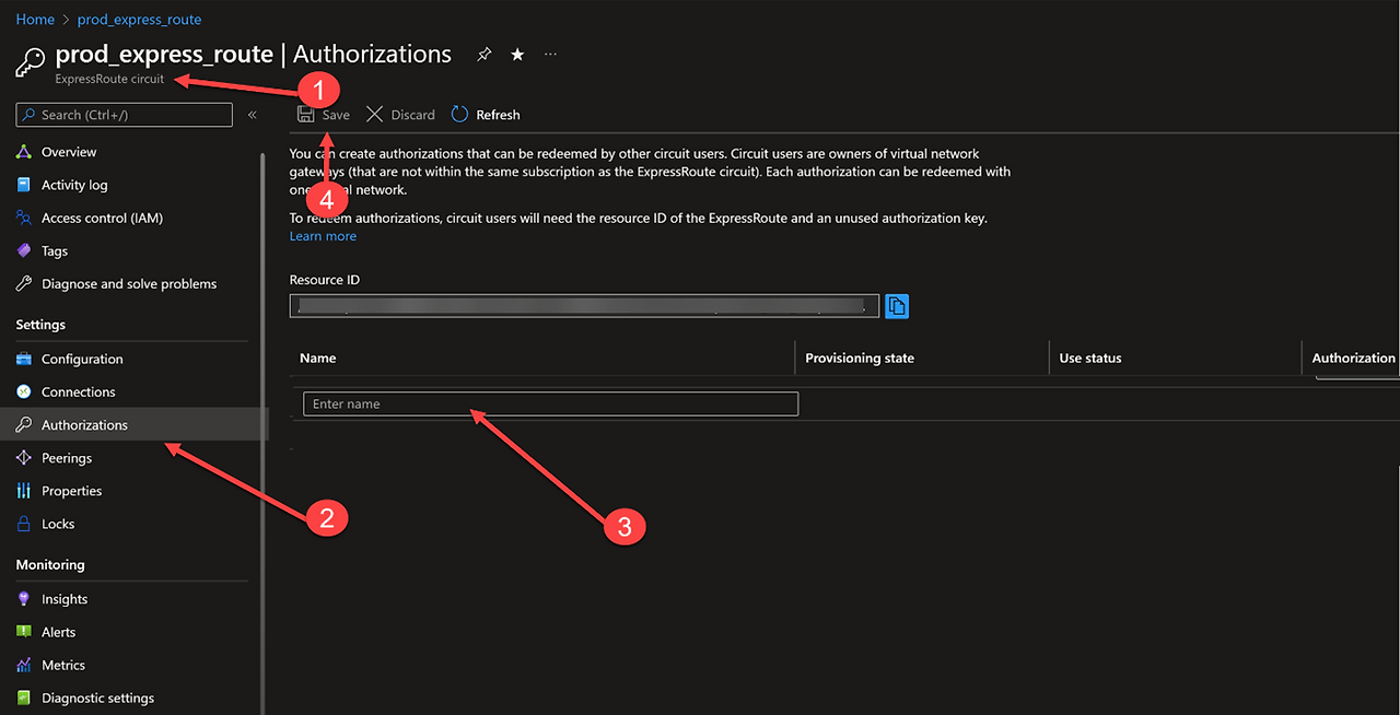 - 온프레미스에서 들어오는 ExpressRoute 회로로 이동합니다. "권한 부여"를 선택하고 이름을 입력한 후 "저장"을 클릭합니다. 참고: "From-<PrivateCloud>"와 같은 이름을 입력하세요.