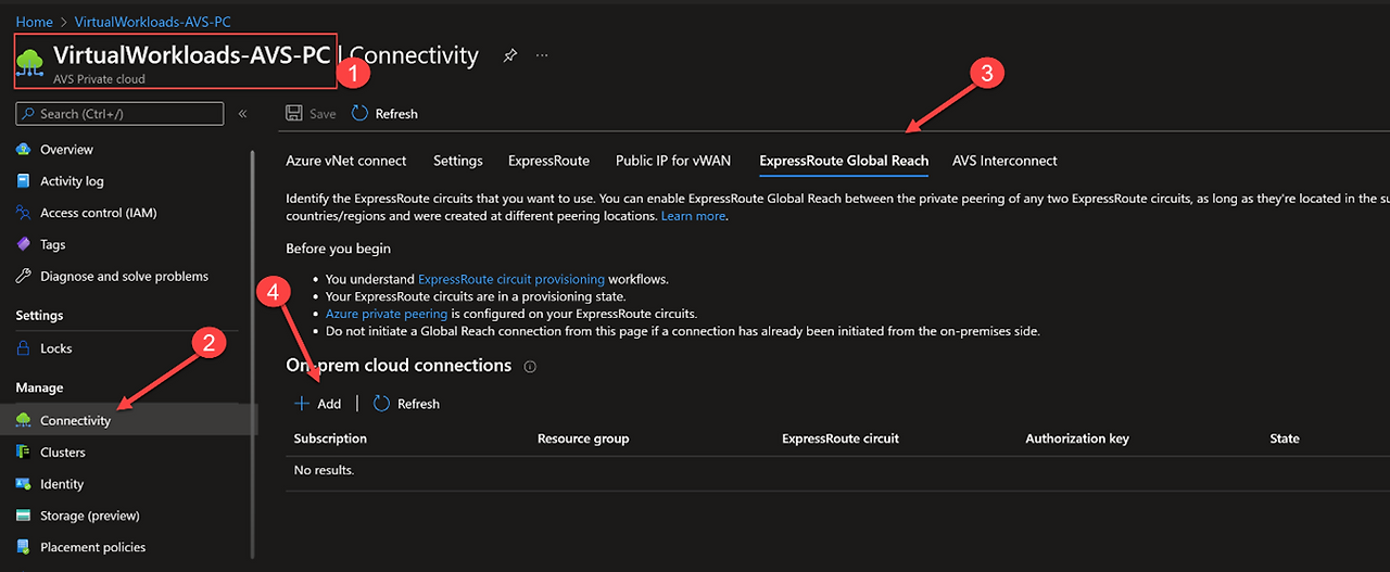 - AVS 프라이빗 클라우드로 이동하여 '연결'을 선택하세요. 그런 다음 'ExpressRoute Global Reach' 탭을 선택하고 '추가'를 누르세요.