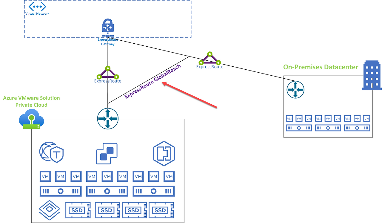 온프레미스 환경은 ExpressRoute를 통해 Azure에 연결되며, AVS와 온프레미스 환경 간의 통신을 설정해야 합니다. 이를 위해 권장되는 (그리고 가장 간단한) 방법은 ExpressRoute GlobalReach를 사용하는 것입니다.