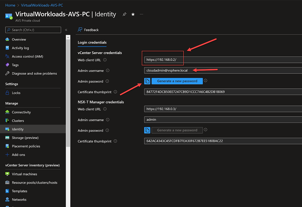 - Azure VMware Solution 프라이빗 클라우드로 이동하여 ID를 선택하세요. vCenter URL, vCenter 사용자 이름, vCenter 비밀번호가 표시됩니다.