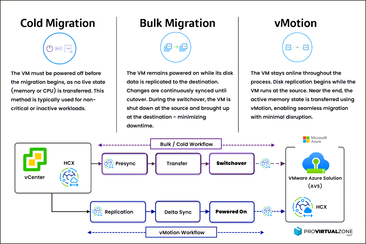 VMware HCX는 마이그레이션의 엔진입니다. 대량 VM 이동, 라이브 마이그레이션, 재해 복구 및 네트워크 확장을 위한 도구를 제공하며, 대역폭 사용량을 줄이기 위한 WAN 최적화(압축 및 중복 제거)와 같은 기능도 제공합니다. HCX는 IP 주소를 변경하거나 복잡한 종속성을 재구성하지 않고도 워크로드를 이동할 수 있으므로 AVS(애플리케이션 보안 시스템) 프로젝트에 특히 유용합니다. 제가 사용할 주요 HCX 마이그레이션 방법은 다음과 같습니다.