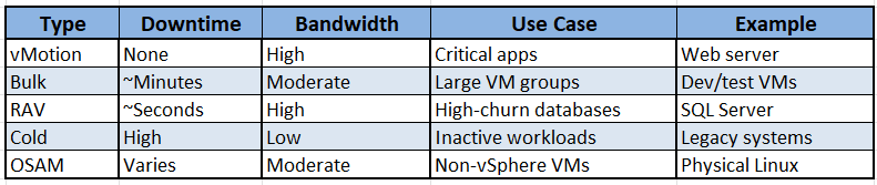 올바른 마이그레이션 유형을 선택하는 것이 중요합니다. 중요한 워크로드에는 vMotion을, 일반 VM에는 Bulk를, 그리고 vSphere가 아닌 환경처럼 필요한 경우에만 OSAM을 혼합하여 사용하는 것을 권장합니다. 참고로, 아래 비교표를 참고해 보세요.