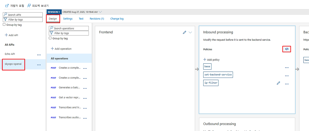 모든 Azure OpenAI 접근은 APIM에서 중앙 관리되며, 키 로테이션, 사용량 모니터링, 정책 적용이 한 곳에서 처리됩니다.