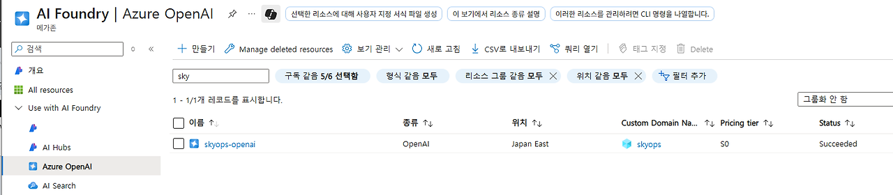 - Azure OpenAI는 한국에서 가까운 "japaneast"로 생성