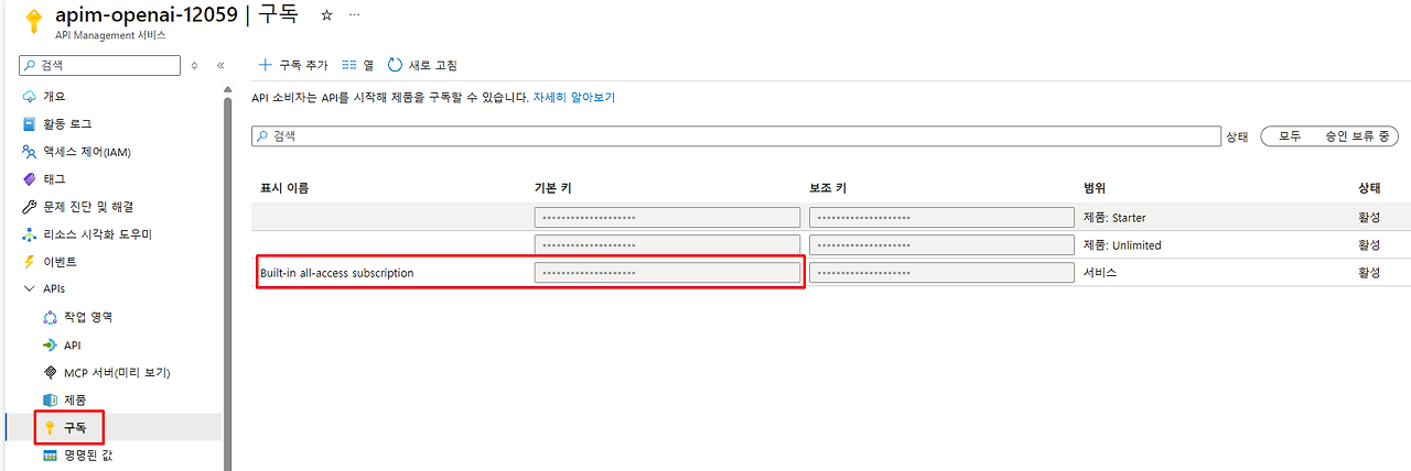 클라이언트는 Azure OpenAI의 실제 API 키를 알 필요가 없고, APIM 구독키만 사용합니다.