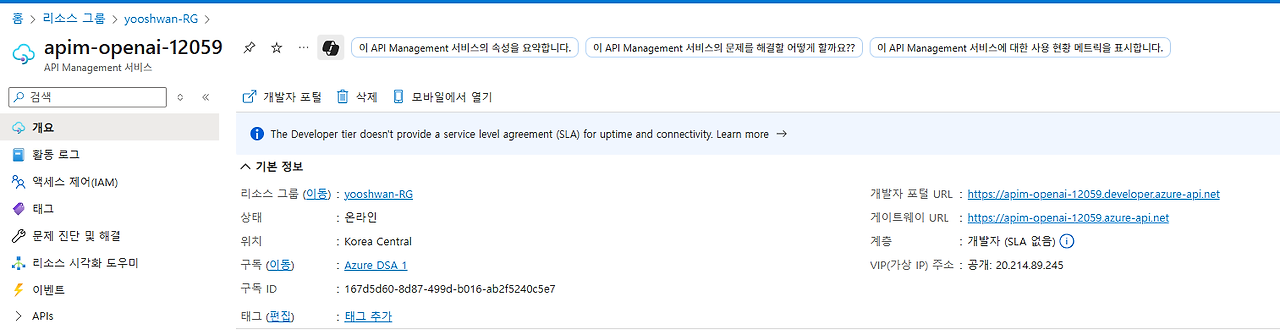 Developer SKU는 개발/테스트 전용입니다. 운영 환경에서는 SLA가 보장되는 Basic 이상의 SKU를 사용하세요.