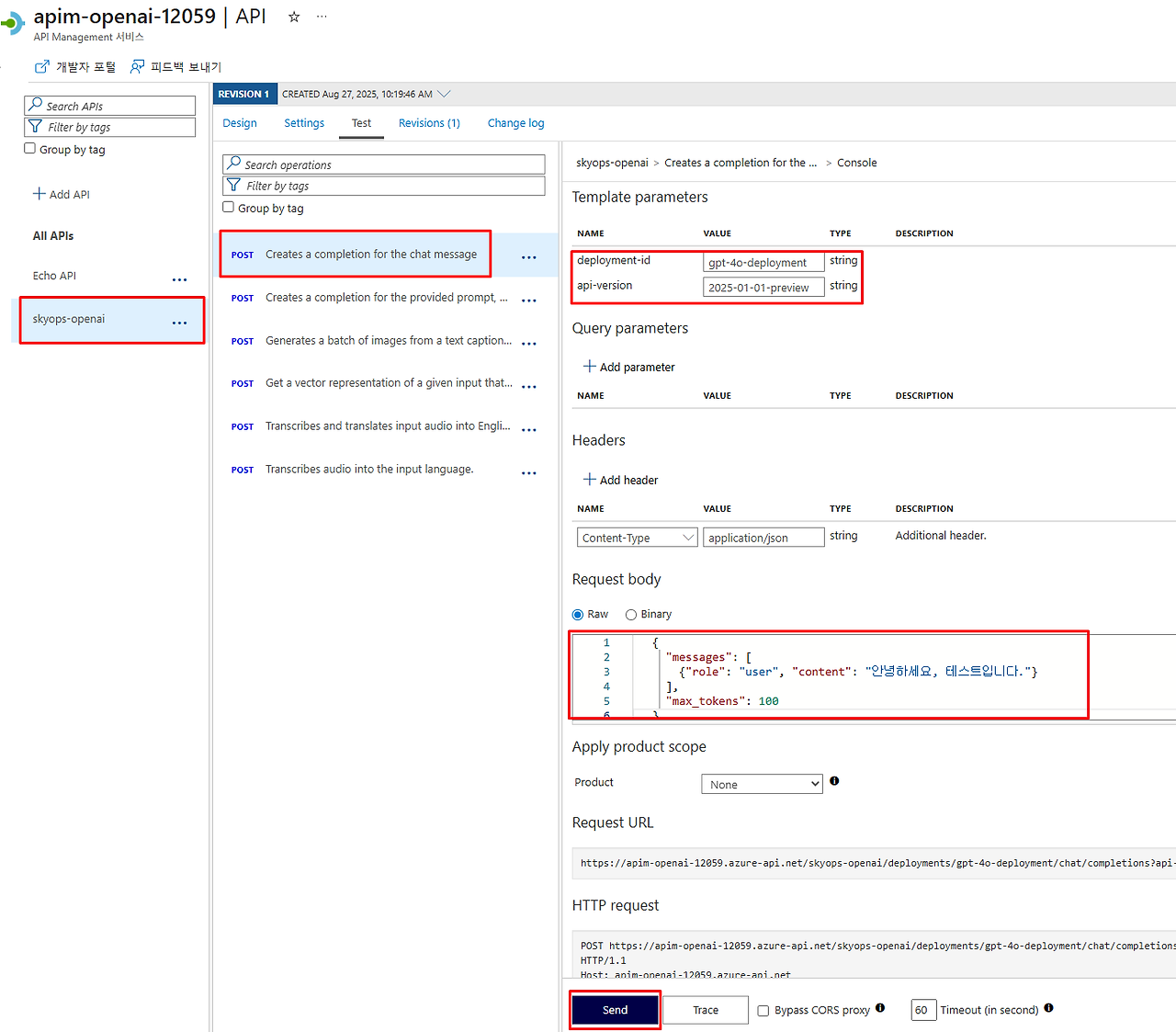 - 테스트 기능으로 APIM ↔ OpenAI 연결 확인